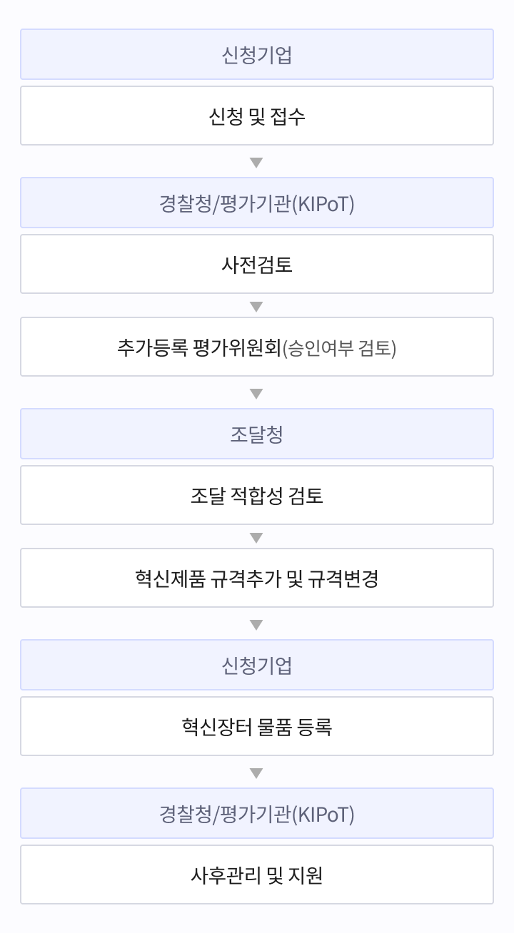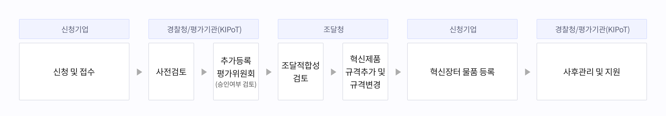 · 신청접수는 연 1~2회 진행예정이며, 접수기간은 경찰청 및 과학치안진흥센터(혁신제품) 홈페이지 등을 통해 별도 공고 예정 (일정확인하기) ※ 기업 신청 수요 및 혁신제품 관련 법령 등의 변경에 따라 지정절차, 일정, 최종 지정 대상기업 등은 변동·조정될 수 있음