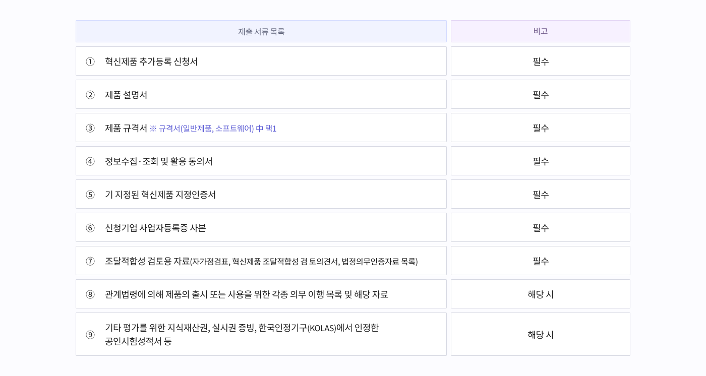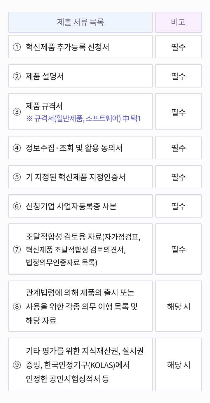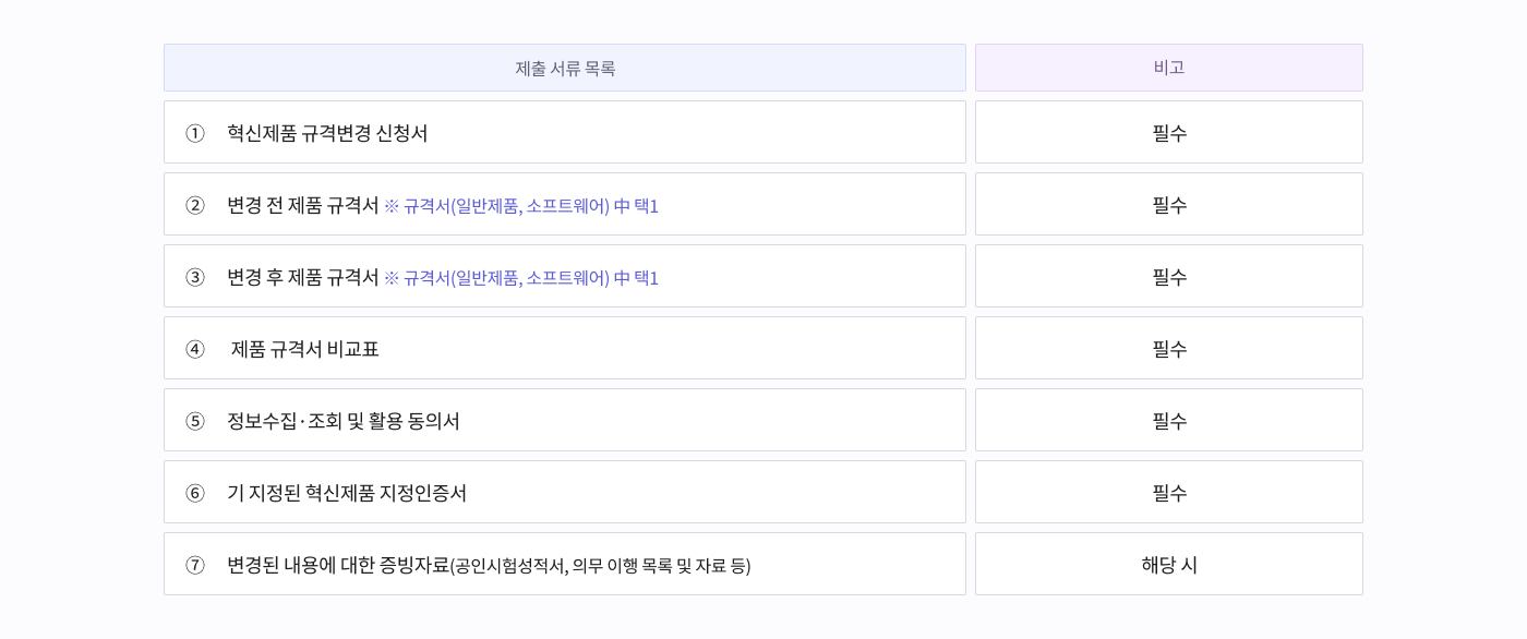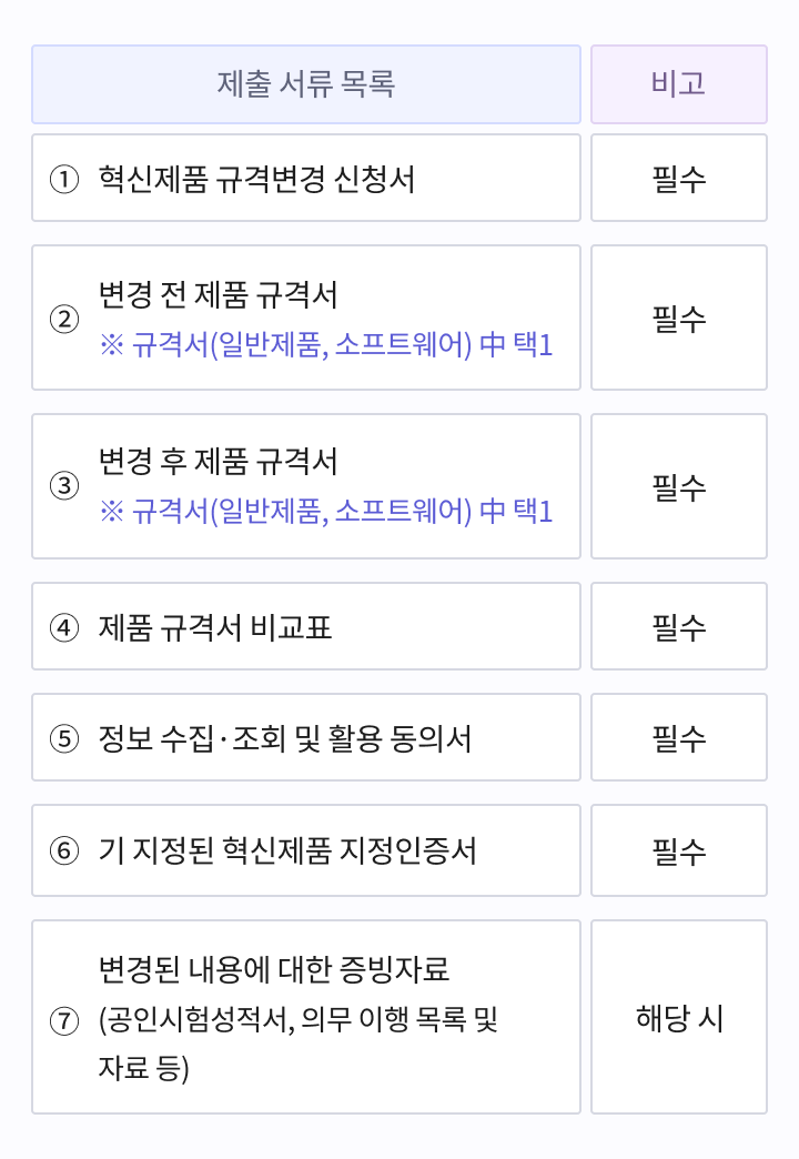 · 제품의 핵심성능은 유지되었으나, 기존에 지정된 혁신제품 규격과 차이가 있어 규격추가 또는 변경하고자 하는 기업